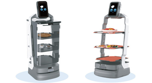 配膳トレイは、最大4段まで設置、最大4ヶ所に連続配膳することが可能。8台の同時運用が可能(理論上は30台以上稼働可能)。配膳ボックスは脱着式で衛生面にこだわり、開放型・配膳ボックス型の両方での運用が可能。