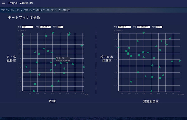 企業価値を最適化させる前提シナリオをAIによって複数生成。各シナリオの財務KPI結果を瞬時に確認し、様々な指標から分析することができ、最適なシナリオを直感的に絞り込むことができるため、最良のシナリオ選択が可能となる。