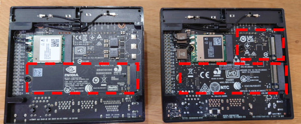 また裏面にはM.2スロットがあり、SSDなど刺せるようになっていますが、「Jetson Xavier NX」と比較すると1スロット追加されているのが、大きな変更点となります。
