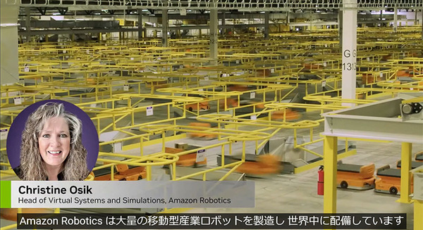 特にAmazon Roboticsの事例では、同社の担当者が解説し、新たに導入した自律搬送ロボット「プロテウス」の学習や移動制御、群管理、物流製品のラインの流れ、アームロボットのトレーニングを含めて、工場とその機器類をデジタルツイン化することで、大きな効果を生んでいることを紹介した。