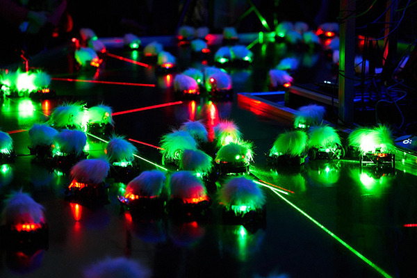 第22回文化庁メディア芸術祭アート部門優秀賞を受賞した作品「Lasermice(レーザーマイス)」からアップデートされた作品となっていて、緑に加えて赤のレーザー光が追加され、各個体の発する光や音が同調したり、多数派や少数派といった関係性が生まれたりするなど、約10㎝のロボット同士がより複雑に影響しあう様子を見ることができる。
