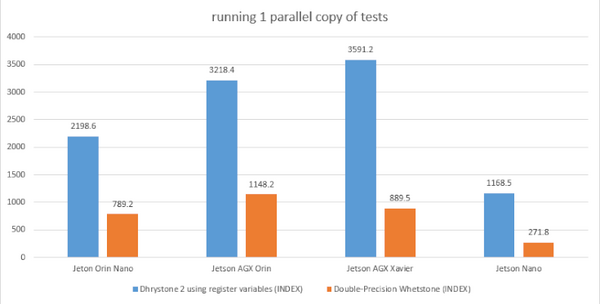 上の表1はrunning 1 parallel copy of testsのINDEX値で整数演算と浮動小数点演算のスピードを比較したものです。