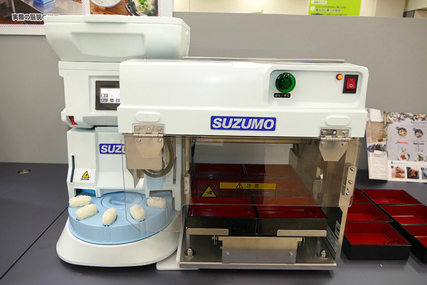 同社の機械は厨房、セントラルキッチン、食品工場など各所で使われているが、大型の機械は自動機、より小型で人のそばで動く機械は「ロボット」と呼称しているとのこと。会場では海苔巻きやおにぎりを作る機械や寿司のシャリを作る機械などのほか、米飯を誤差3g程度で定量、弁当容器に盛り付けたり、人の数倍の速度でシャリ玉を持ち帰り容器に並べる機械などが実演されていた。