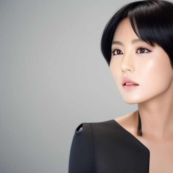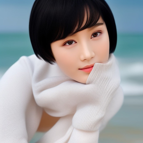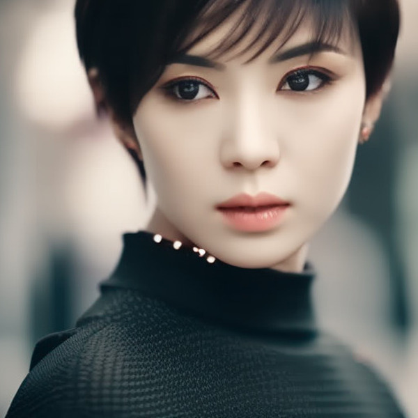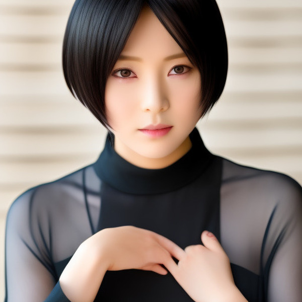 「美しい日本の女優、ショートカットの黒髪、クールでスレンダー、小顔、美しい顔、美しいモデル、顔のクローズ アップ、ソニー α7、35 mm レンズ、f8 の写真、一人」【公式画像】