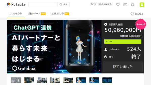 Gateboxは、OpenAIが提供する会話生成AI「ChatGPT」による新型AIキャラクターを開発するために2023年3月11日から実施したクラウドファンディングの募集期間が2023年4月29日に終了し、目標金額の10倍を超える5,096万円の支援を達成したと発表した。