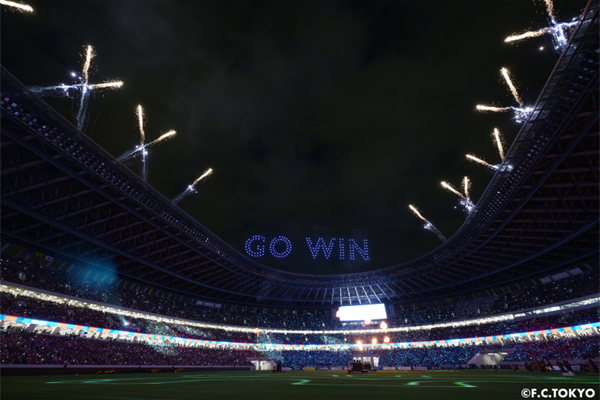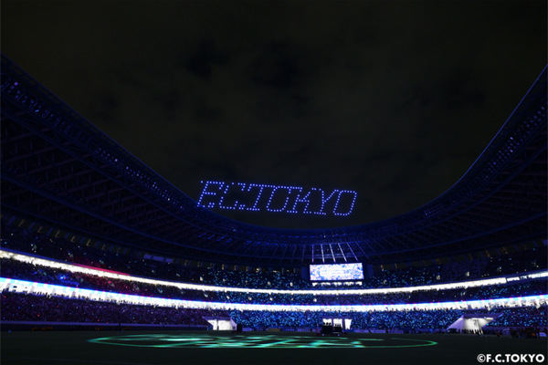 キックオフ直前の国立競技場上空(屋根上)で、ドローンショー社が開発・製造するドローンショー専用機体200機が、FC東京のチームカラー青と赤を基調に、「F.C.TOKYO」や「GO WIN」など、精密にプログラミングされた美しいパフォーマンスを披露。