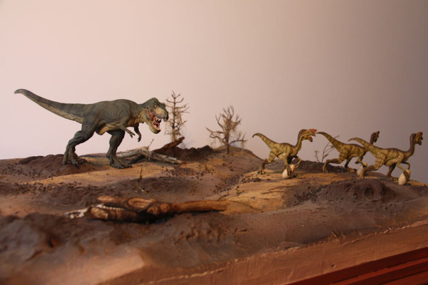恐竜のジオラマ(スピノサウルス、ティラノサウルス、トリケラトプス)