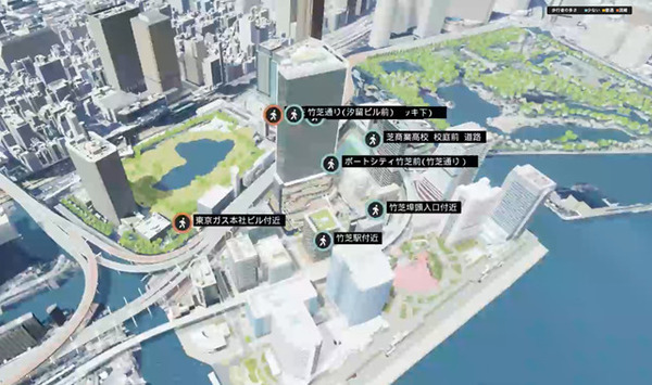 そこで、東急不動産とソフトバンクは、正確さや精度を追求した3D都市データの制作技術とハイクオリティーなコンテンツの表現力を持つキャドセンターや、クラウドを活用したアプリケーション、AI・IoTの開発に強みを持つFusicと共に、竹芝地区のデジタルツインを構築し、自治体と施設間の情報連携や来訪者の一時滞在施設への避難、一時滞在施設における入館時の受け入れ対応などの効率化を検証した。自治体や施設管理者から、一時滞在施設の開設情報や満空情報を、「LINE」などを通して帰宅困難者に伝えることで、施設へのスムーズな誘導や受け入れが可能になる。