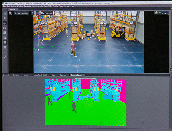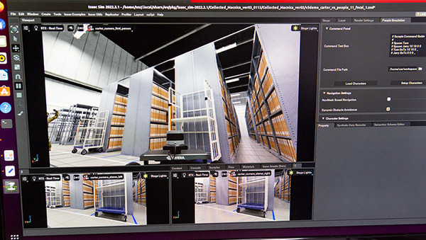 倉庫内に配置され、移動している「人」は、最近「Isaac Sim」に搭載された機能。仮想倉庫内に人を配置して、座標間を人物が行き来することが容易にできるようになった。