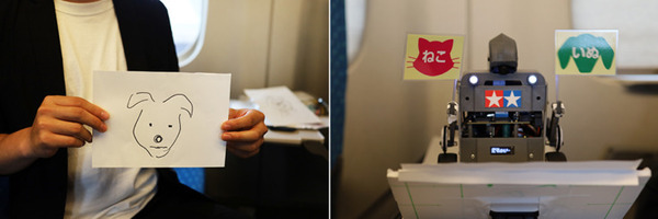 続いて、同社 マーケティング&ソリューション本部 鵜山敬悟氏、株式会社タミヤ 営業部 石崎隆行氏が登壇。参加者に紙とペンを配布し、「犬」「猫」どちらかの絵をその場で描いてもらった。その絵を 「犬」「猫」を判別できる AI プログラムを読み込ませたタミヤオリジナルデザインロボットに見せることで、AI がその絵が犬なのか、猫なのかを判別する。AI ロボットがすぐに判別できたり、悩んだり、時には間違えたりしながら「犬」「猫」の旗を振り、会場は大いに盛り上がった。