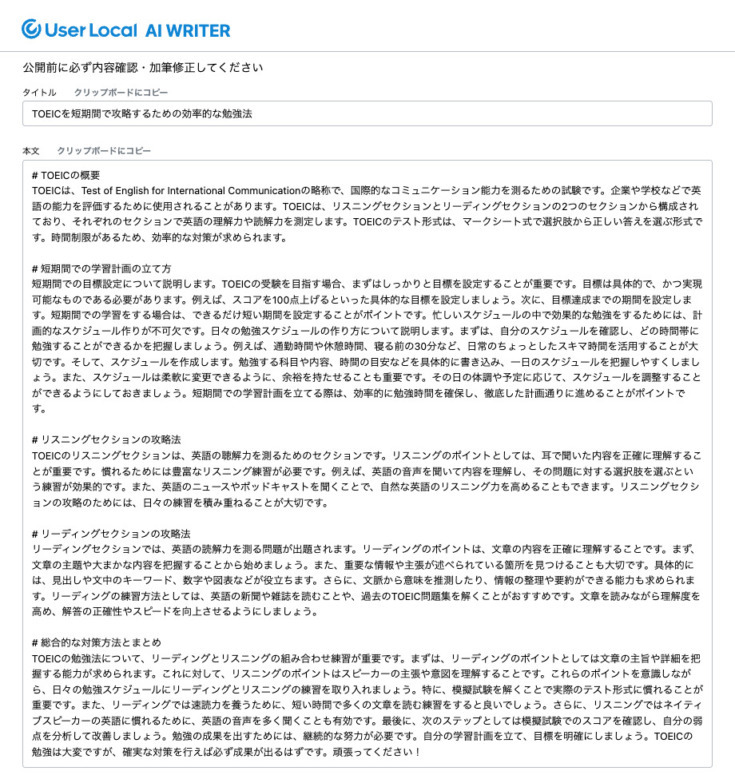 「この文章構成でAIに執筆を依頼する」ボタンを押すと自動で記事が生成される。生成された記事を利用者がより正確な内容に加筆修正できる。