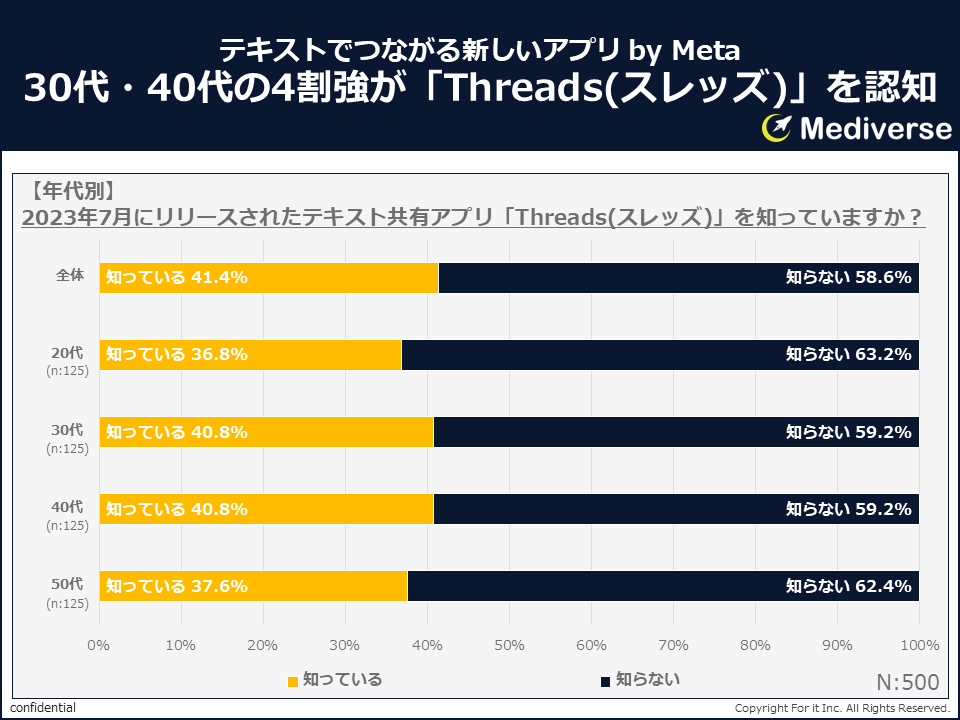 リリースから3日後に、Mediverseが行った独自アンケート調査によると、国内におけるThreadsの認知度は4割以上という結果が出ており、その影響力の大きさが垣間見える。