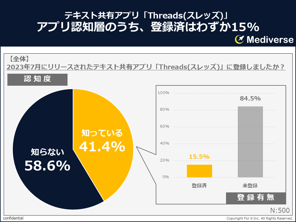 Threadsを認知していると回答した41.4%のうち、実際に登録を行っていたのはわずか15.5%という結果となった。