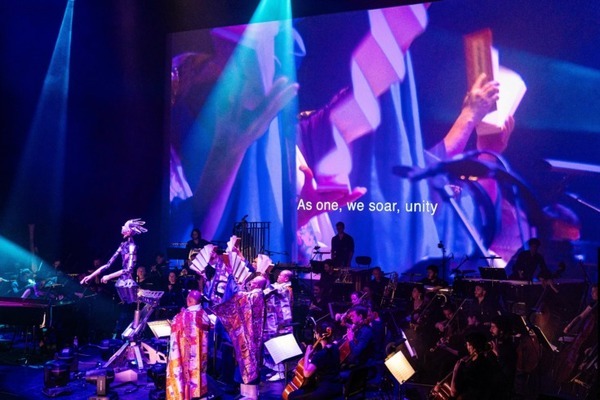 “Android is a Mirror”とオルタ4の合成音声が響き渡り、オーケストラ、そして藤原栄善を始めとする5人の声明が折り重なる。ジュスティーヌ・エマールの映像演出も加わり、アンドロイド・オペラの重層性を示しながら、“Let’s celebrate this new experience together” とオルタが宣言しながら序曲が終わる頃に、鉢(はち:仏教音楽である声明で用いるシンバル状の楽器)の音からすぐさま「Scary Beauty」に移行。流麗なオーケストレーション、複雑に奏でられる不協和音を交えながら観客を引き込み、そこにオルタ4の歌が、そして5人の僧侶の声明が重なり圧倒的な情報量の中で序盤の盛り上がりを迎えた。