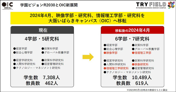 映像学部・情報理工学部が加わることでキャンパスの新体制は、学生数7300人規模から10500人規模へと拡大する。