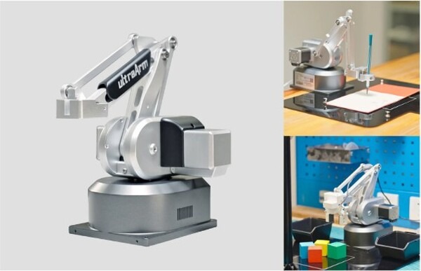 「UltraArm P340」は、金属製のアームと高精度なステッピングモーターを搭載することで、±0.1 mmの位置決め精度と高い安定性を実現。可動領域はA5用紙ほどで、グリッパーやペンホルダーなど様々なエンドエフェクタと自由に組み合わせることができる。ROS、ROS2によるロボット制御からmyBlocklyによるブロックブログラミングに対応しており、教育機関や研究機関、職業教育など、さまざまな用途で使用できる。