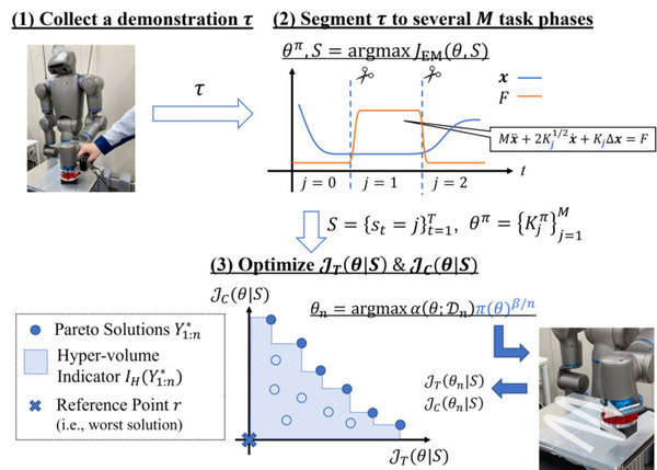 また、タスクの達成のためには連続する複数の動作(例えばドアの場合、(1)ノブに近づくアプローチ、(2)ノブを回す、(3)ドアを開ける)を正確にこなす必要があるが、動作毎に最適なインピーダンスゲインが異なるため、図1に示すように、まずパラメータ最適化が行いやすいよう教示した一連の動作を分節化し、多目的ベイズ最適化により各分節の最適なインピーダンスゲインを求める二段階の手法を考案した。