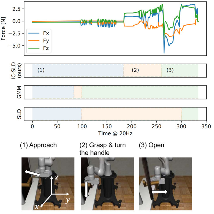 前段として今回開発した分節化手法「IC-SLD(Impedance Control-aware Switching Linear Dynamics)」は、教示した一連の動作がインピーダンス制御が想定するバネ系の運動方程式の複数の組合せによって生成されたと仮定し、方程式内の未知のインピーダンスゲインと方程式の切り替え時刻を推論する問題として定義する。IC-SLDはこの問題を、予測される軌道と実際の教示軌道の誤差を最小化することで求解し、従来法(e.g., GMM((Gaussian Mixture Model)混合ガウスモデルによるクラスタリングに基づく分節化), SLD((Switching Linear Dynamics)教示の動作が単純な線形方程式の組合せで生成されたと仮定した分節化)と比較し、IC-SLDは最適化に適した分節化を実現した。