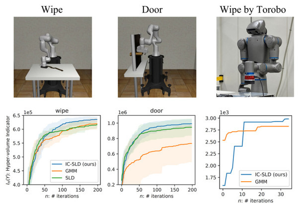 続いて後段では、事前知識を活用したベイズ最適化(未知の関数の形状をデータから学習しつつ、できるだけ少ないデータ数でその関数の最適解の推定を試みる手法)によりインピーダンスゲインを探索する。IC-SLDはインピーダンスゲインの推定値も出力するため、これを解候補として活用することで最適化を効率化する。事前知識を利用可能なベイズ最適化 π-BO [Hvarfner+,ICLR2022] を応用し、タスク性能の指標(報酬関数の累積和)と、安全性の指標(剛性パラメータの累積和)を同時に最適化するインピーダンスゲインをロボットの動作試行を繰り返しながら探索する。