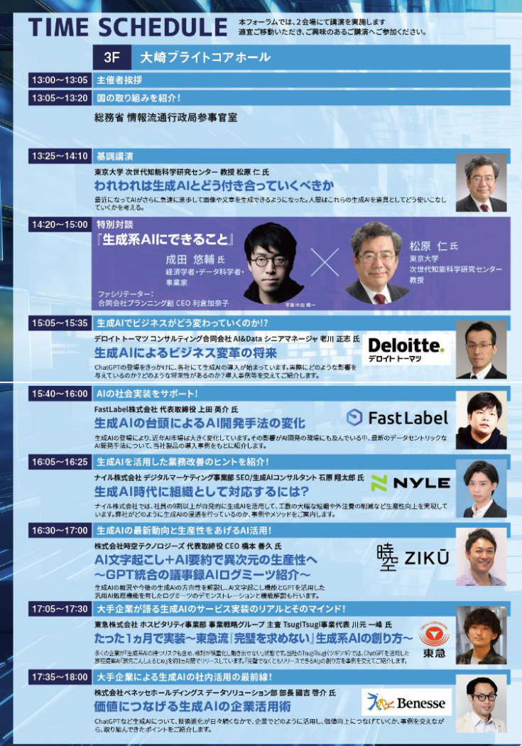 このフォーラムでは、世界中で急速に利用範囲が拡大している高精度な対話式AI「ChatGPT」をはじめとする、「生成系AI」のビジネス活用の可能性や社会にもたらす変革をテーマに、新技術や実装事例などのご紹介を通してイノベーション創出やネットワーク構築のきっかけとなる場を提供する。