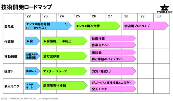 技術開発のロードマップも発表された。今回は第一弾としてエンタメ用「アーカックス」のリリースとなるが、その次世代機を開発すると共に、実用的な作業もこなせるロボット宇宙開発のように人が作業困難な場所で業務できるロボットも視野に入れている。