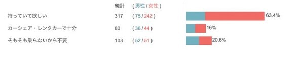 同調査結果によると、若者の7割以上が、現在、または将来の自分のパートナーに「自動車運転免許」を「持っていて欲しい」としており、若者の6割以上が、現在、または将来の自分のパートナーに「クルマ」を「持っていて欲しい」と回答した。