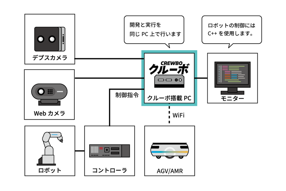 ロボット制御ソフト「クルーボ」はロボットシステムをシンプルに構築することができる。ロボット手先に搭載されたハンドアイカメラと、モバイルマニピュレータに搭載された固定カメラの合計2台のカメラと、「クルーボ」をインストールした制御コンピュータ1台で複数のビジュアルフィードバック制御を実現可能。