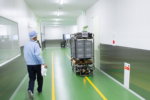 現状で、大型の無人搬送車(AGV)8台と小型の自律走行搬送ロボット(AMR)17台が工場内を走行している。