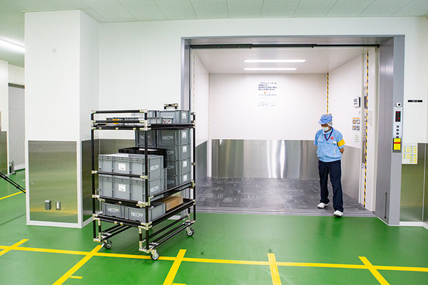 なお、衛生面では各フロアの入り口にAGVからの搬送物も高速エアーにより除塵するための、エアシャワー付きバスボックスも設置されている。