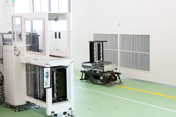 基板生産をおこなう3階では生産ラインと連携して、大型のAGVが基板を積んだラックを搬送していた。