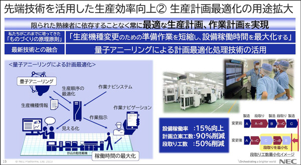 量子アニーリングの導入もそのひとつだ。電子部品をプリント基板に実装する表面実装工程(SMT工程)において、量子コンピューティング技術をベースにした「生産計画立案システム」を導入し、作業計画や人員配置を最適化している。量子は最適化問題を高速に処理するのに適している。