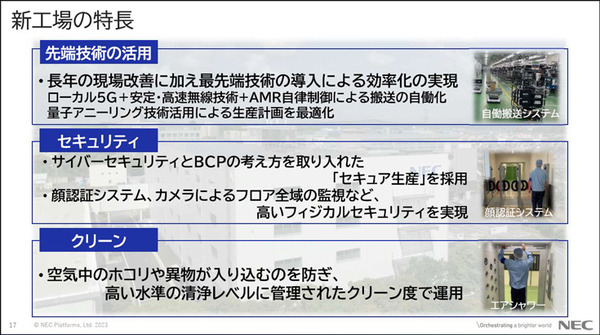 NECグループは社内の開発や生産拠点が協調して1つのファクトリーのように振る舞う「ONE FACTRY」というコンセプトを推進している。この掛川工場もそのひとつだ。そしてここでは特に、最新技術を取り入れ、セキュア生産の「安心安全」、ロボットラインやクリーンルームを活用したスマート工場による「高効率・高品質」、太陽光発電による「エコ」を掲げている。