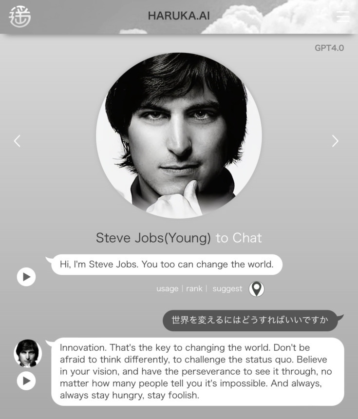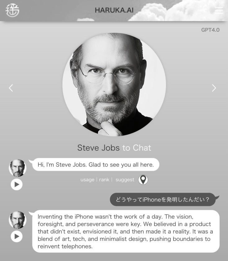 以下のような質問をHARUKA.AIにするとスティーブ・ジョブズらしい答えが返ってくる。