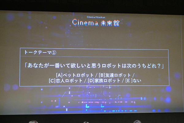 「心のありか」や、「人間とロボット」の繋がりが「AIの遺電子」のテーマの一部だ。以上を踏まえて、トークテーマ1、ディスカッションの内容は「あなたが一番いて欲しいと思うロボットは?」へ移った。聴衆にはペットロボット、友達ロボット、恋人ロボット、家族ロボット、そして「ない」という選択肢が提示された。結果は、ペットロボット、ない、友達ロボット、となった。