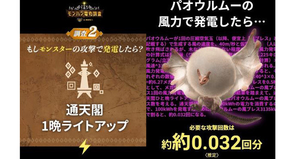 ゲーム内に登場する3種類のモンスターの攻撃でもし発電をしたらどれぐらいの電力が賄えるかを、通天閣などの関西ゆかりのスポットに必要な電力と照らし合わせて、関西電力が専門家の力を借りて 本気で調査した結果を公開している。