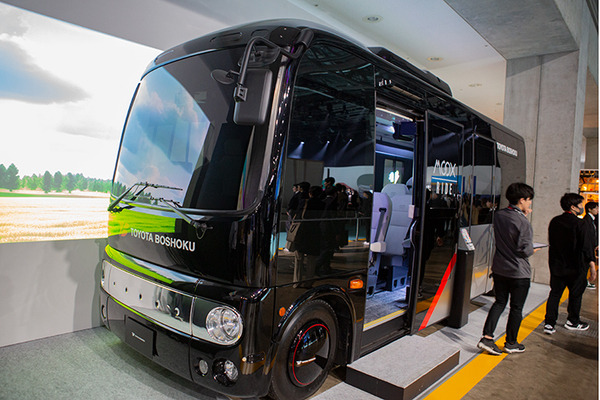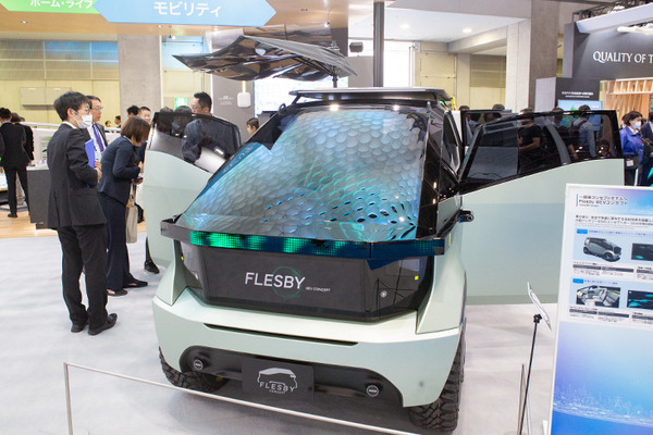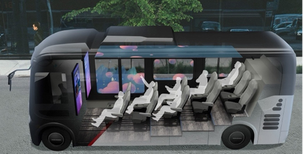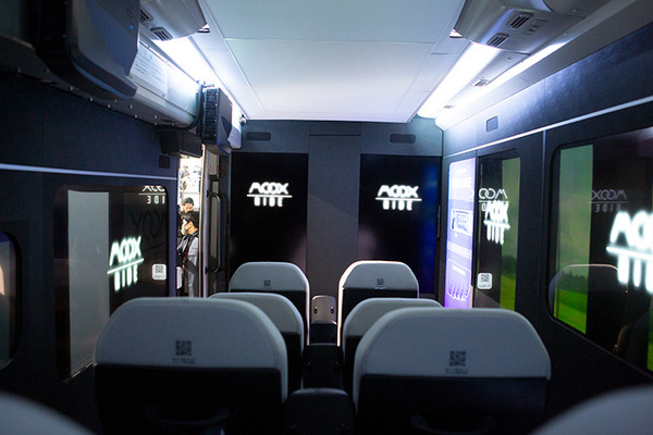 トヨタ紡織とABALが開発した「MOOX-RIDE」のプロトタイプ。「MOOX-RIDE」とは、透明ディスプレイやミスト装置、立体音響システム、振動する座席など五感で体感する移動型エンタメ体験バス(バス自体はポンチョだが、内部はインテリアやシートの専門企業のトヨタ紡織が手がけた)。筆者も体験したが、窓(ディスプレイ)の向こうの景色が流れて振動を感じると本当にバスが走っているような錯覚を感じる。