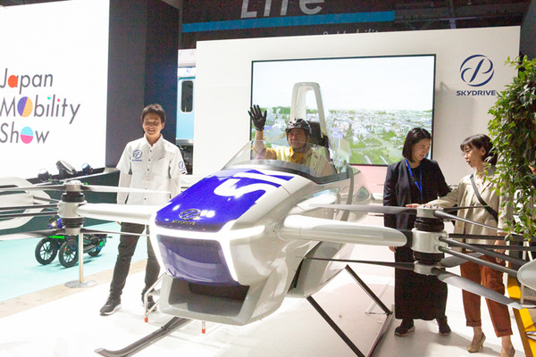 ここでもスカイドライブの空飛ぶクルマを展示。もちろん飛び上がらないが、コクピットに乗車体験はできる。
