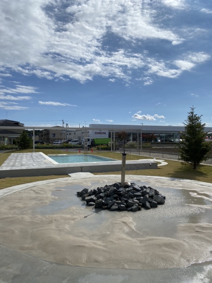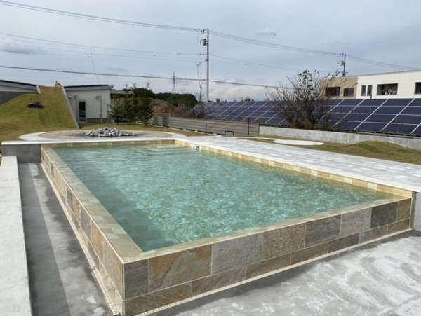 車でドライブスルーを進むと、澄んだ水面が美しいプール目に飛び込んできて、日常を忘れる美しさにリゾート気分を感じることができる。このプールには1年中35tの濾過された水が貯えられており、災害の断水時には生活用水としても役立つ。