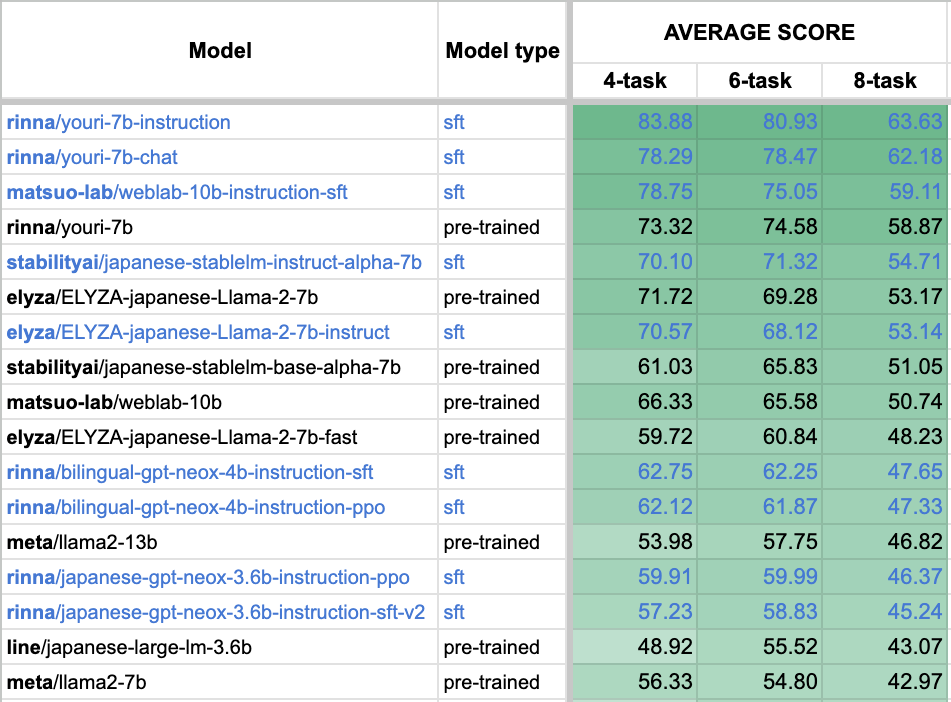 日本語言語モデルの性能を評価するためのベンチマークの一つである Stability-AI/lm-evaluation-harnessの8タスク平均スコアは58.87となっている。ベンチマークスコアの詳細はこちらから確認できる。