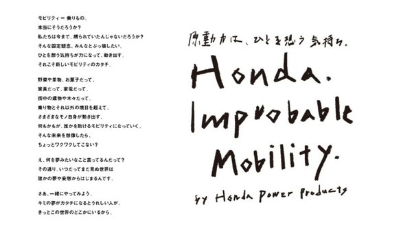 「Honda. Improbable Mobility. by Honda Power Products」は新モビリティ=乗りものという固定概念を疑い、壊し、人々が持つ「夢」を見る力で新しいモビリティのカタチを探す試み。応募するのは誰かのために動かしたいもののアイデアが描かれた「ラクガキ」のみで、野菜や果物、お菓子、家具、家電、街中の建物や木々など、なんでも構わないとのこと。応募された自由に発想したアイデアをHondaがさまざまな形でモビリティ化し、動かす。