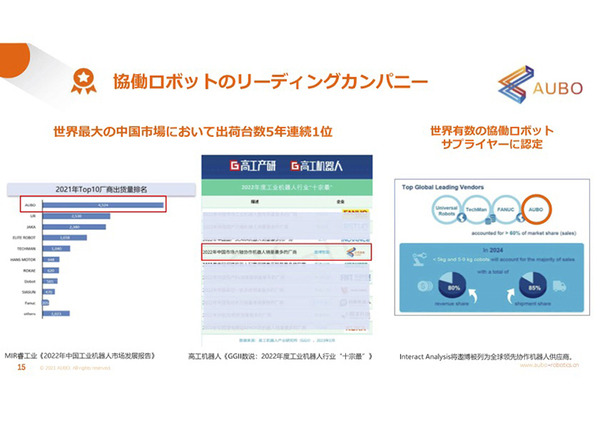 協働ロボット市場でいま大きくシェアを伸ばしている中国企業がある。2015年に創業されたAUBO Robotics Technology(AUBO)だ。2021年頃から急激に成長を始め、既に23,000台以上のロボットをグローバルで販売している。AUBOは2023年4月に日本法人を設立。本格的に日本国内に進出を始めた。武器は価格競争力、導入前サービスやアフターフォローだ。