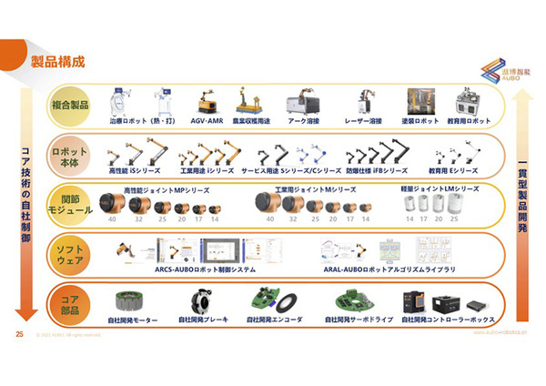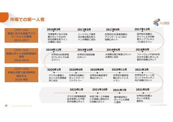 協働ロボット市場で、およそ半分のシェアを持っているのがデンマークの企業・ユニバーサルロボット(UR)だ。協働ロボット市場を切り拓いたパイオニアであり、トップを走っている。そして特に2021年以降、急激に存在感を増しつつあるのが中国の遨博(北京)智能科技股份有限公司、AUBO Robotics Technology(AUBO)である。