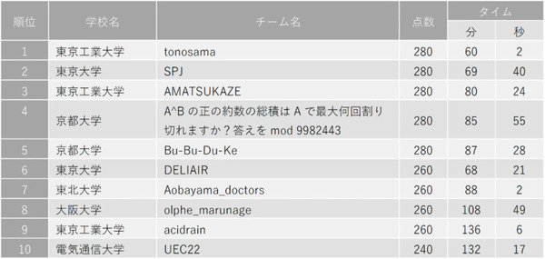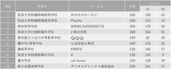 高校・中学・小学校・その他スクールの部では、筑波大学附属駒場高等学校のチーム「めがめがわーるど」が優勝。同校は2019年から毎年2位を保持しており、今回が悲願の初優勝となった。一方の灘高等学校のチーム「KMB76」は今回は7位となり大会初の4連覇とはならなかったが、中学3年生から高校3年生までの4年間、常にこの部門をリードした。