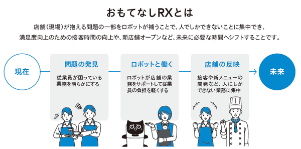 「おもてなしRX」とは、人でしかできない(人がやりたい)業務以外をロボットが補うことで、満足度向上のための接客や、新メニュー開発などの、人にしかできない業務に集中するための取り組みとしており、DFA Roboticsのブースでは以下を紹介するとしている。