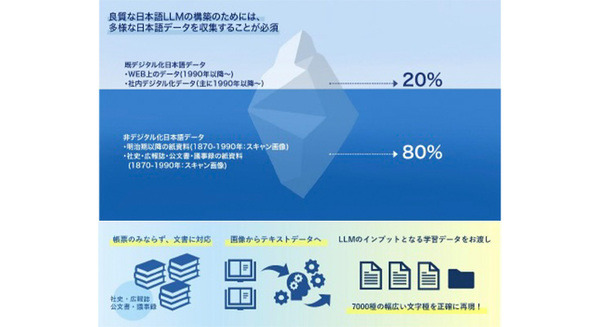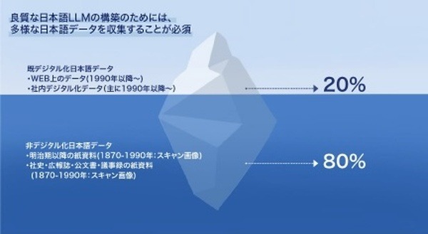 良質な日本語LLMの構築のためには、多様な日本語データを収集することが必須だが、一般的に収集可能な日本語テキストデータは主にインターネット普及後の1990年以降のものが中心となっており、1990年以前の文書(社史・広報誌・公文書・議事録等の保存文書)の多くはデジタルデータ化されておらず、効率的に収集することができていなかった。