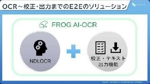 機能は全てクラウドで利用可能で、出力テキストの確認・修正作業を効率良く行うことが可能となる。FROG AI-OCRは、国立国会図書館のNDLOCR(https://github.com/ndl-lab/ndlocr_cli)をコアエンジンとして利用している。