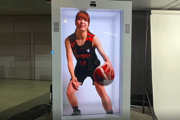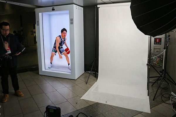 ホログラム風の等身大3D映像を公開!プロバスケの有名選手とツーショット写真が撮れる!高校バスケの全国大会でソフトバンクが展示