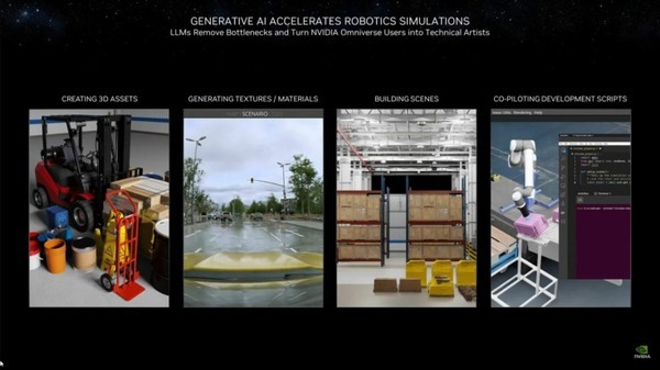「NVIDIA Picasso のような生成AIツールを使用すると、ユーザは単純なテキスト・プロンプトからリアルな3Dアセットを生成し、それをデジタルシーンに追加して、動的で包括的なロボットのトレーニング環境が実現できます」と続け、「通常はテクニカル アーティストが数日かかって制作するタスクが、生成AIやLLMを使用して数分で完了します。スクリプトを記述する際にも、生成 AIがコパイロット(支援役)として機能します。プロンプトを入力し 必要なコードを生成してロボットのシミュレーションを実行するか、自動でラベル付けされた合成データを生成すれば、膨大な費用と時間が節約できます」と語った。