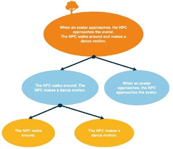 「行動ロジック生成AI」は、メタバース空間内のNPCの行動を規定する一意のビヘイビアツリーをテキスト入力のみで自動生成する技術だ。NPCの行動はビヘイビアツリーという手法を用いて規定されることが一般的で、ビヘイビアツリーの作成はこれまでプログラム開発者が要求仕様をコード記述を用いて制作するなど、ある程度の技術が必要であった。さらに、3つの生成AIを自動連携する技術の開発により、「行動ロジック生成AI」で生成したビヘイビアツリーと、「アニメーション生成AI」で生成したNPCの骨格データ、「外見生成AI」で生成したNPCの3Dモデルの3つを連携させ、テキスト入力のみでNPCを自動生成することが可能となる。