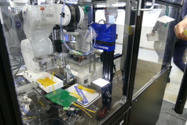 最近はロボットも、だいぶ器用になっていて、色々なものが扱えるようになっている。普及が進んできた3Dカメラを使って物体を正確に認識してハンドリングする方式が一般的だ。「FACTORY INNOVATION Week 2024」でも、クラボウが独自開発して販売しているビジョンセンサー「クラセンス」を使ってケーブルをピッキングする様子をデモしていた。